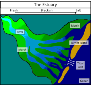 In the estuary, you will encounter water quality characteristics that fall in between freshwater and saltwater. Estuaries are also unique because tidal forces influence them. Tides are the regular rise and fall of water in the ocean caused by the gravitational pull of the sun and moon. At high tide, the ocean pushes into the estuary and saltwater moves closer to the land. At low tide, the estuary drains and the ocean is pushed back to be replaced by freshwater flowing from the land. These regular movements of ocean water into and out of the estuary cause the salinity at any given location within the estuary to continually change. Estuarine organisms, therefore, must be able to tolerate a variety of water quality conditions.